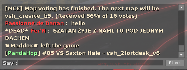 Steam name: Fer'N Steam ID32: STEAM_0:0:90052144 Server: FF2 #13 Links: Hlstats and Sourcebans Rules broken: Speaking a language other than english + insulting players Evidence: Attached file + Chat History