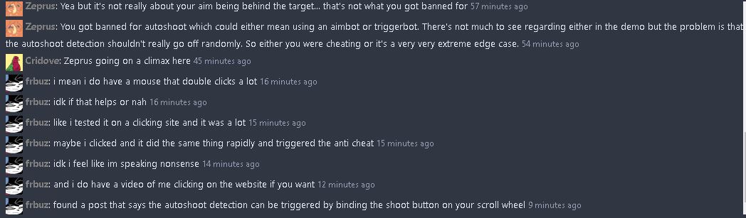 11/02/2022 23:11:50 [Version 1.7.1] {Name: "frbuz" | SteamID: STEAM_0:0:183434867 | IP: } was banned for Aimbot.