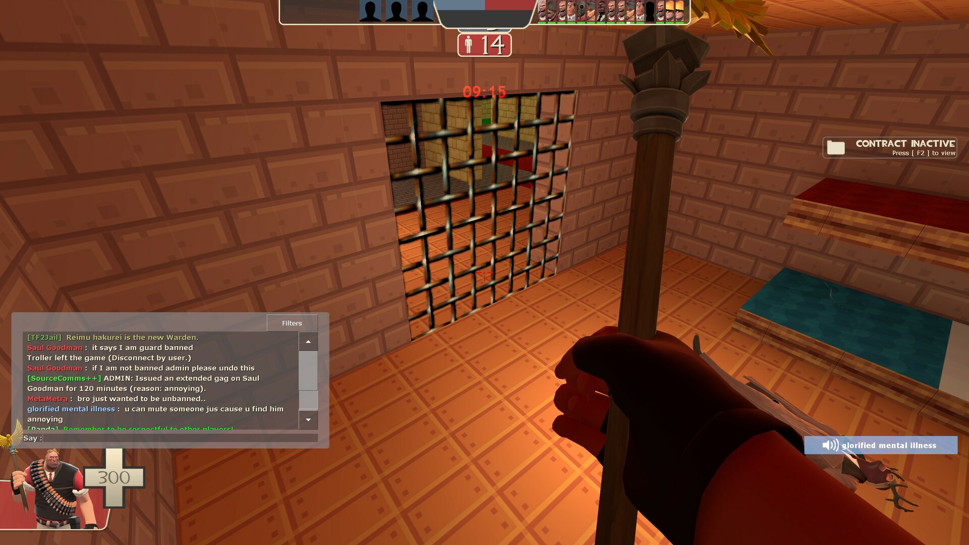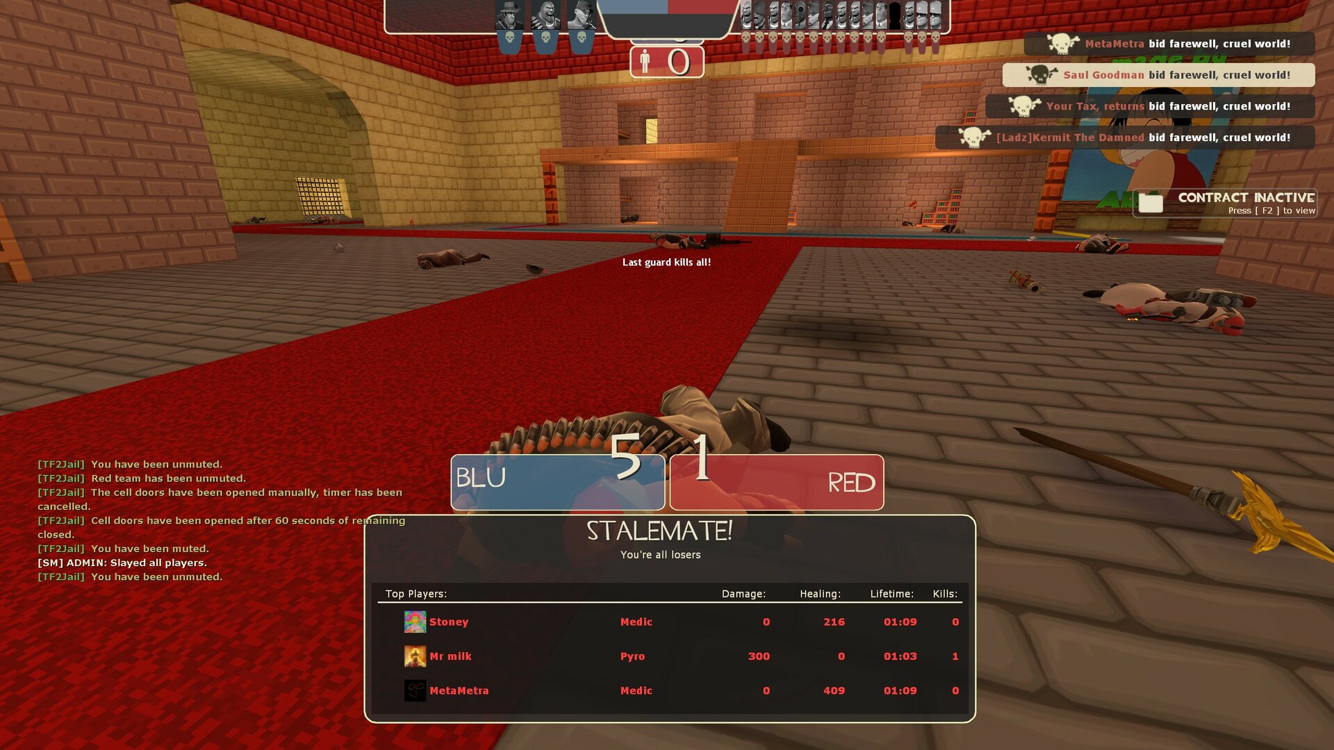 So what happened was I was a guard on the jailbreak server and as the reds were lined up in front of cells, one guy wasn't afk frozen so I shot at him but hit another red - he wasn't killed and they were sent to medic later, but then another blu accidentally freekills another red as he's also trying to get this rebeller. This admin decides to guard ban me, revive the freekilled red and do nothing about the sniper. Then he says in chat "I didn't do a thing lol" and "you aren't banned I have console you suicided" as well as "you aren't guard ban you're just doing an act" when I asked to be unbanned. Next round I am confirmed as guard banned and I ask the admin again to unban me but then he just mutes and gags me for "annoying". He straight up lies about me not being banned then mutes me when I confirmed it and asked again to be unbanned.