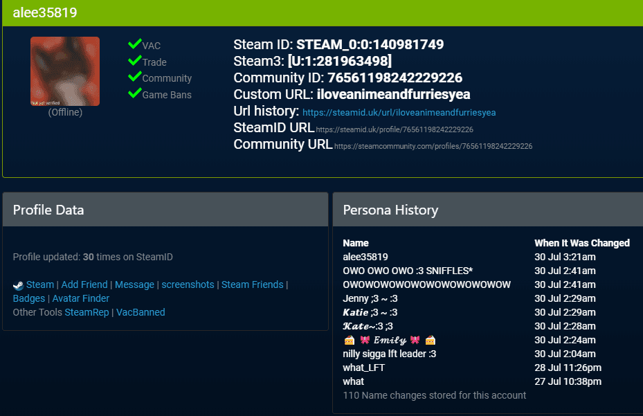 Note that the OWOWOWO guy changed his name multiple times. He eventually even changed his name to an innocent player's name ( alee35819 ) - probably to avoid getting banned. In the status below "OWO OWO OWO :3 SNIFFLES*" is the freekiller.