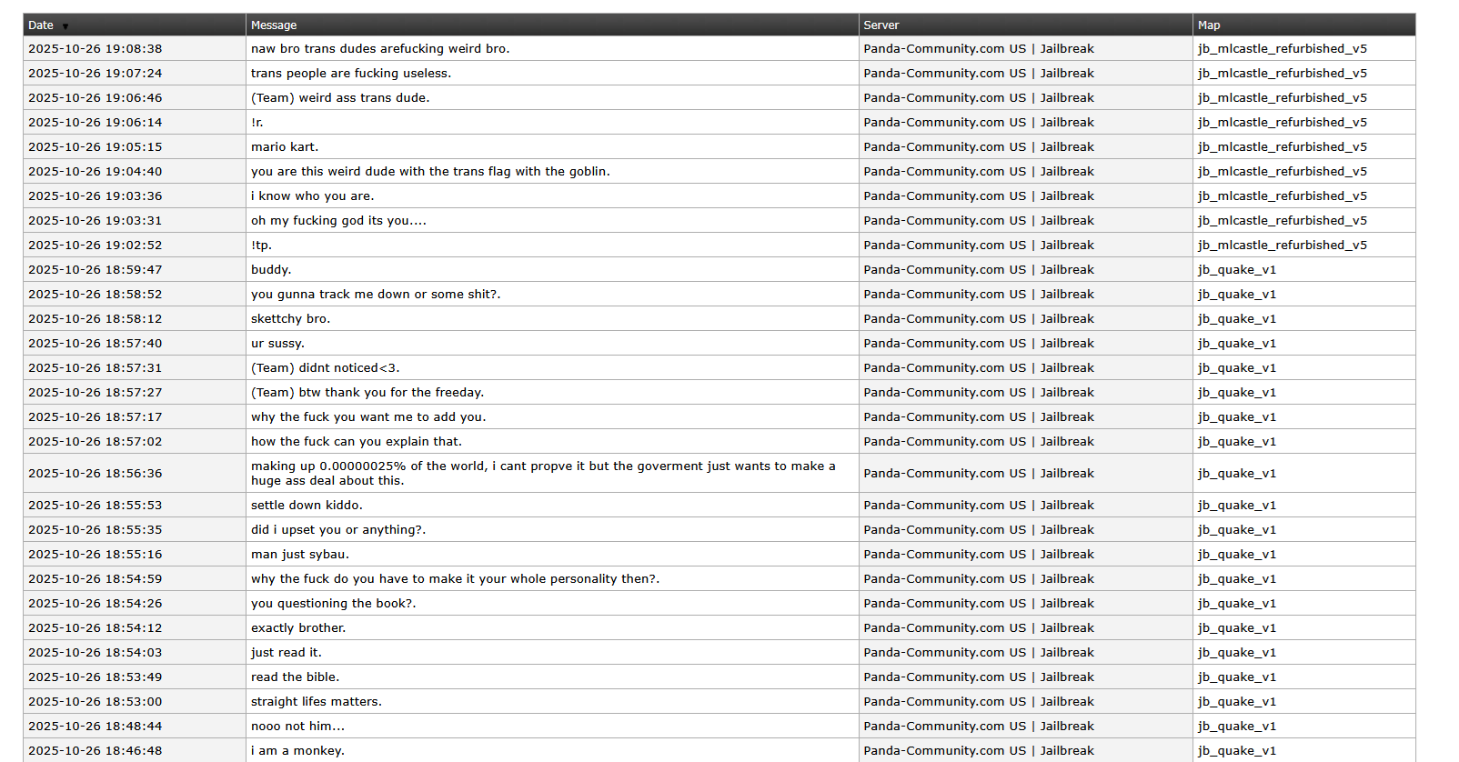 Any other proof you have https://hlstats.panda-community.com/hlstats.php?mode=playerinfo&player=377951 << user profile /// https://hlstats.panda-community.com/hlstats.php?mode=chathistory&player=377951 << chatlogs