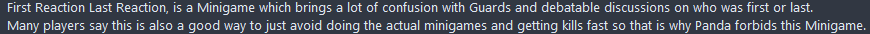 Soccer trivia is a game where all players afk freeze on the soccer field and the warden asks a trivia question. The first red to answer correctly gets to hit the ball. This process repeats until there's a winner. Recently I've seen an increasing number of players tell me that soccer trivia is illegal, but never any admins. I have seen an admin (and many players) say that "Diner minigames must be done inside diner" and "Trivia must be done inside trivia." But as far as I can tell neither of these are actually rules (you could argue it's common sense though.) In fact the rules do support wardens making their own minigames or variations on minigames as long as they're outside cell area. The only other argument I can see against soccer trivia is that it's too similar to "first reaction last reaction" since you can only win by answering first. However trivia and freeze dance are both similar to FRLR in the same way and are still allowed, so I don't really think that argument makes sense.